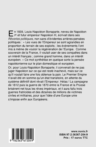 En 1839, Louis-Napoléon Bonaparte, neveu de Napoléon ier et futur empereur Napoléon III, écrivait dans ses Rêveries politiques, non sans d’évidentes arrières-pensées politiques : « Les vues de l’Empereur se sont agrandies en proportion du terrain de ses exploits ; les événements l’ont mis à même de vouloir la régénération de l’Europe. Comme souverain de la France, il voulait user de ses conquêtes dans un intérêt français ; comme grand homme, dans un intérêt européen. » Ce mot synthétise en quelque sorte la pensée napoléonienne sur le plan domestique et européen. Or, pour Louis-Napoléon Bonaparte, il convenait de ne pas juger Napoléon sur ce qui est resté inachevé, mais sur ce qu’il voulait faire une fois obtenue la paix. Le Premier Empire n’avait été en somme qu’un état transitoire, en attente du système définitif dont rêvait l’Empereur. Hélas ! La campagne de 1812 puis la guerre de 1870 entre la France et la Prusse brisèrent net tous les rêves impériaux, et il aura fallu trois guerres fratricides et des dizaines de millions de victimes civiles et militaires, pour que l’idée d’une Europe unie s’impose enfin aux Européens.